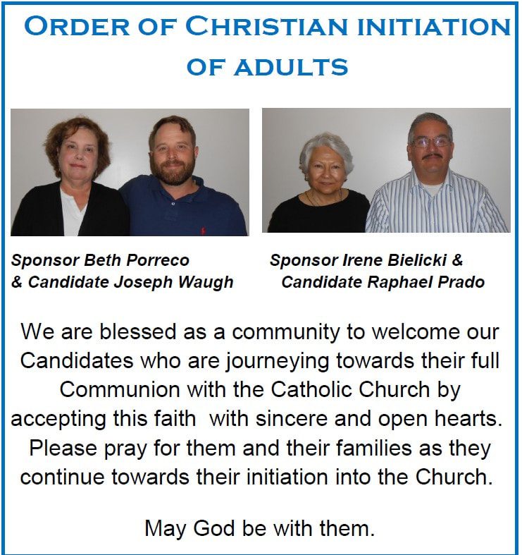 Bless all those who minister through the RCIA process so that, under the guidance of the Holy Spirit, they may lead others to a life of faith in Jesus Christ. Grant that all parishioners will take an active role in bringing new members into the Church. Call us all to a renewal of our faith, and inspire us all to be your light in the world.